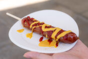 次にチョコバナナですが、このチョコバナナはシンプルにおいしそうなチョコバナナで1本と3本で選ぶことができます。チョコソースがたっぷりかかっているのに加えて特筆すべきはなんと皮ごとバナナを一度焼いているということです!これはまた期待値高めです!さっそく実食してみます!