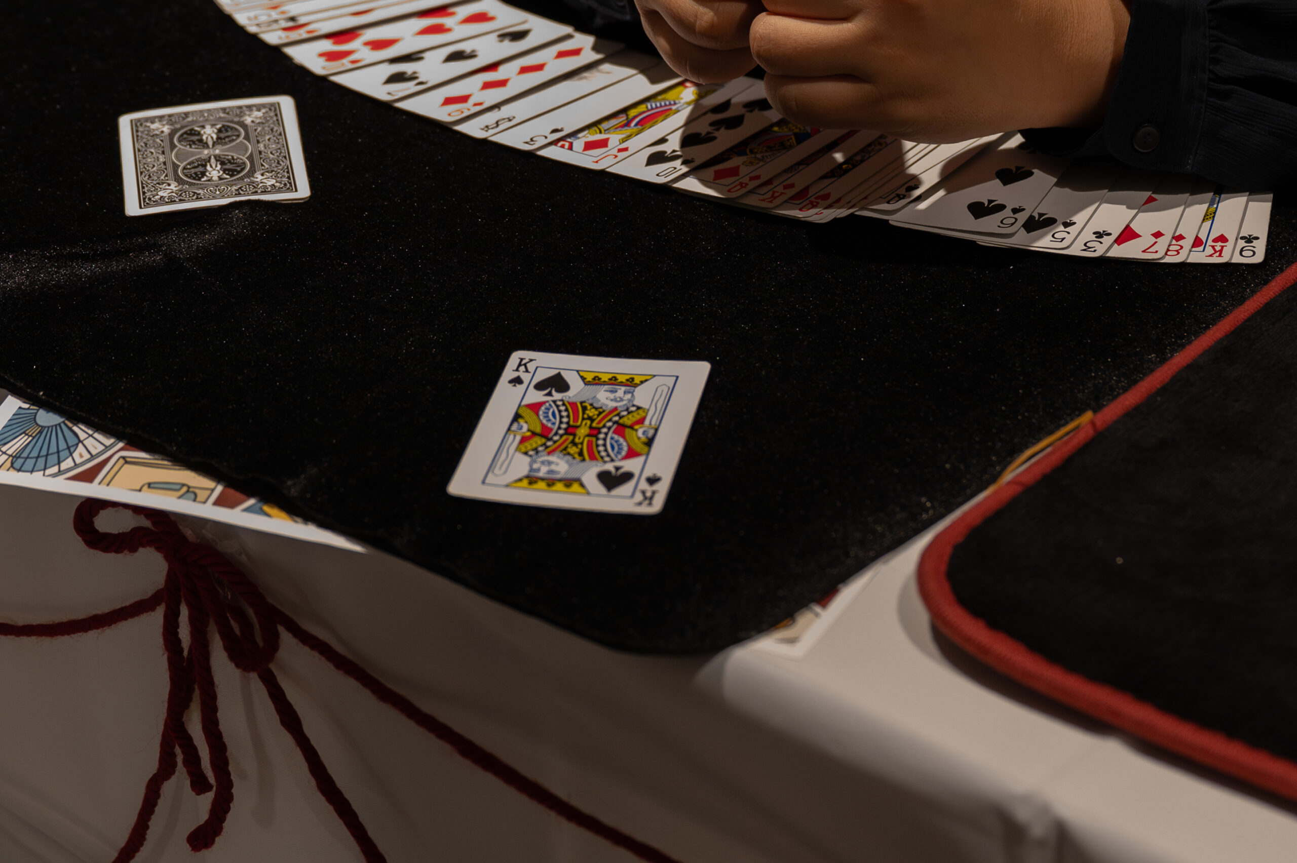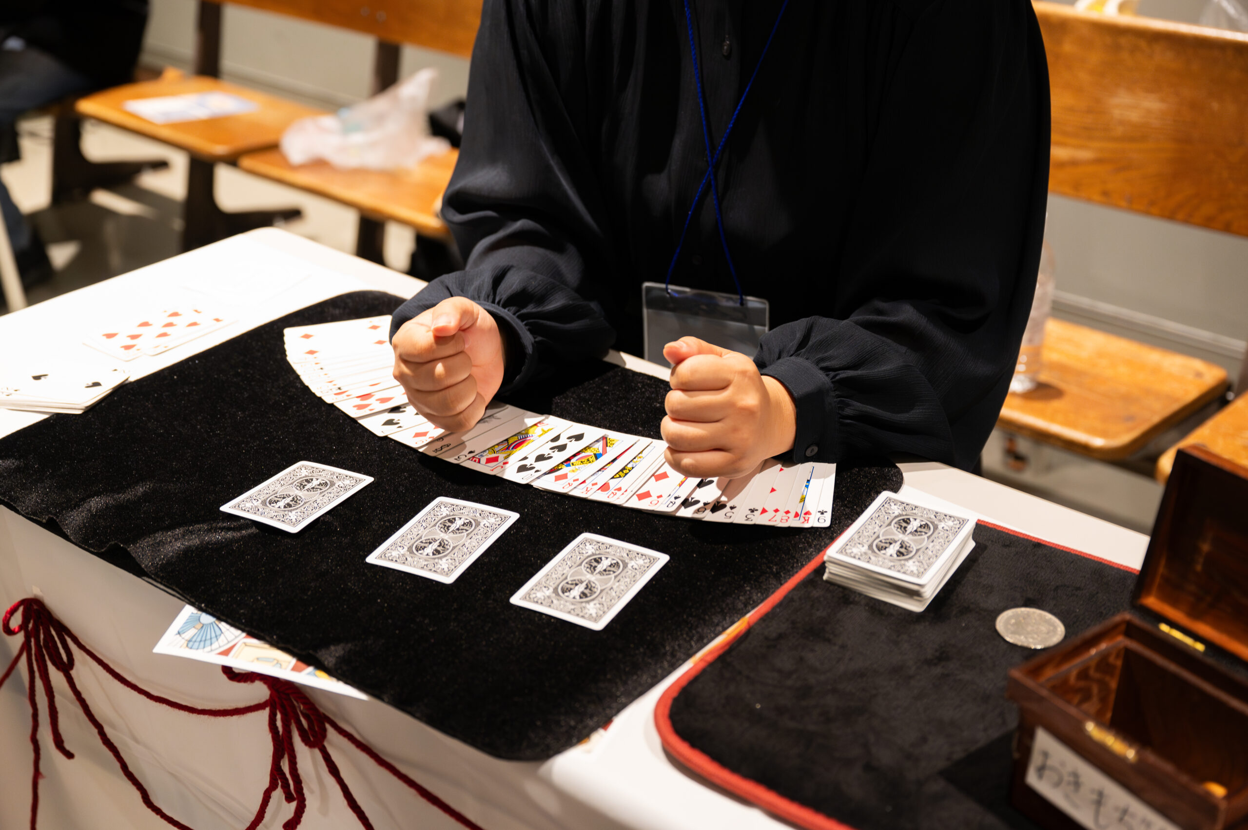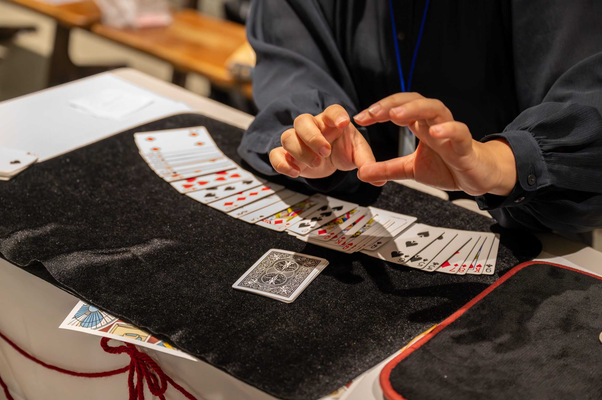 次に体験したマジックは、混ざり合っていたはずのカードを一瞬で整然と並び替えるマジックでした。まるで色が反発し合うかのように、黒と赤のカードをきれいに分離させる光景は、本当に信じられないほど鮮やかでした。