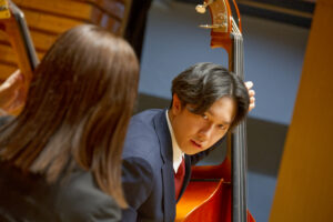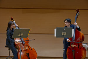 今回の定期演奏会では、なんとコントラバス二重奏で行われました!コントラバスならではの重厚感と迫力ある低音が響き渡り段の合奏とはまた違った魅力を感じました。演奏中には、弓で弾く奏法と弦を弾く奏法を変えながら演奏するのが見えて、目でも耳でも楽しめる“見ごたえ”と“聴きごたえ”のある演奏でした!!!